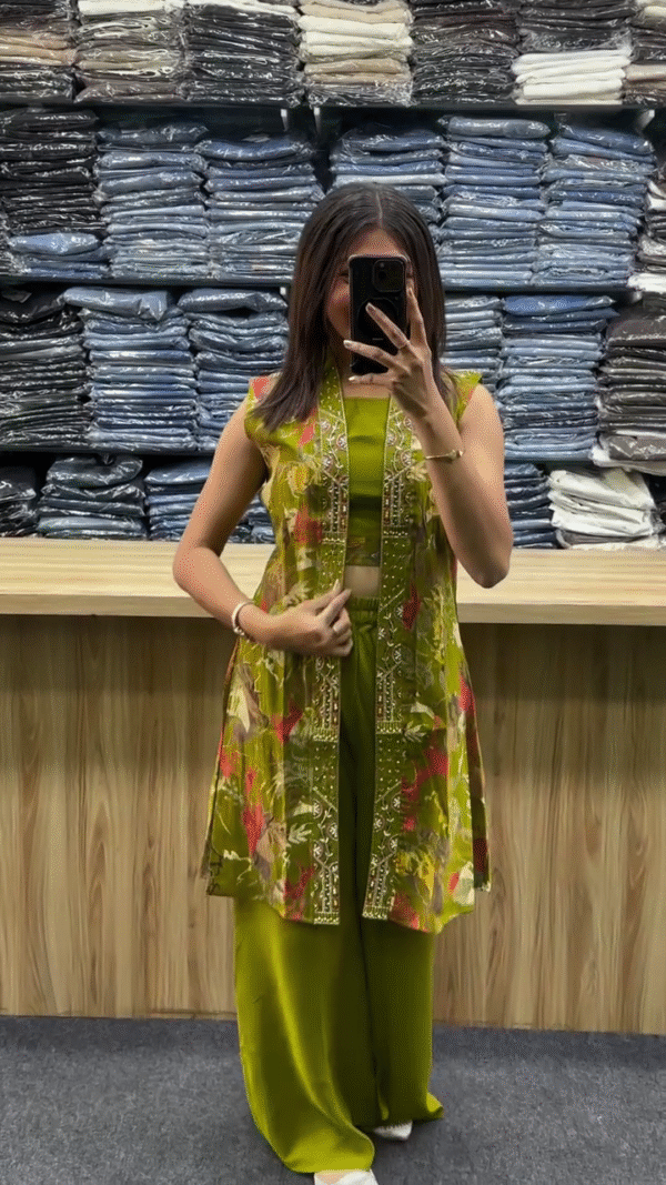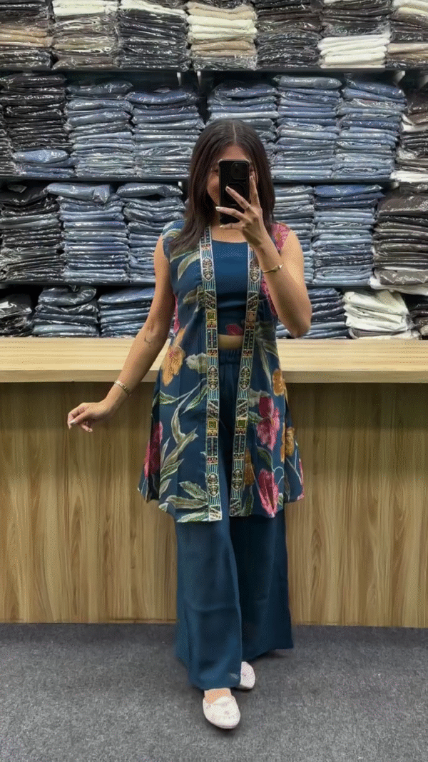 + Free ShippingThis trendyย ย co-ord setย features a sleeveless inner top, wide-leg pants, and a long printed jacket with ethnic-style embroidered bordersย .
