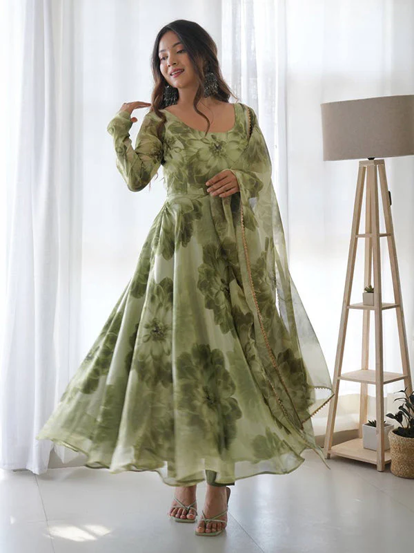 Mehandi Organza Printed Anarkali Gown With Pant & Dupatta Set
