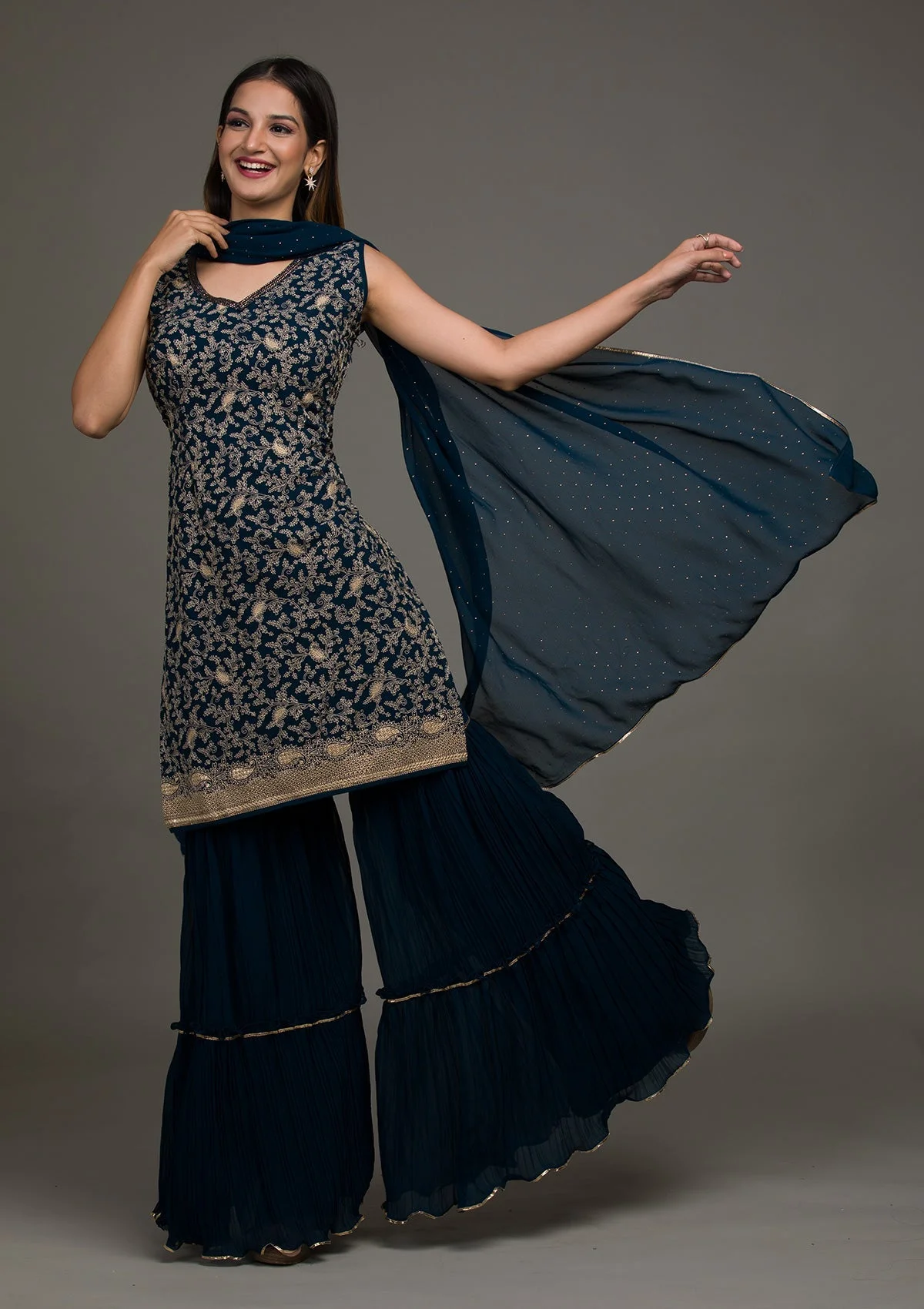 – Peacock Blue Salwar suit tailored in Georgette fabric – Elevated with Threadwork Embroidery – The Salwar Suit Is Accompanied With A Bottom